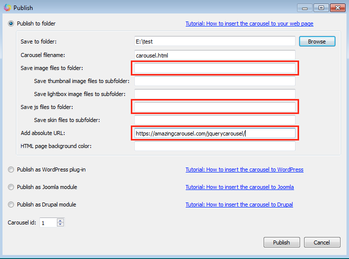 In Amazing Carousel, step 3 Publish dialog, empty the text input box “Save images files to folder” and “Save js files to folder”, add the folder URL that you created in above step to the “Add absolute URL” box, then publish the carousel to a local folder.