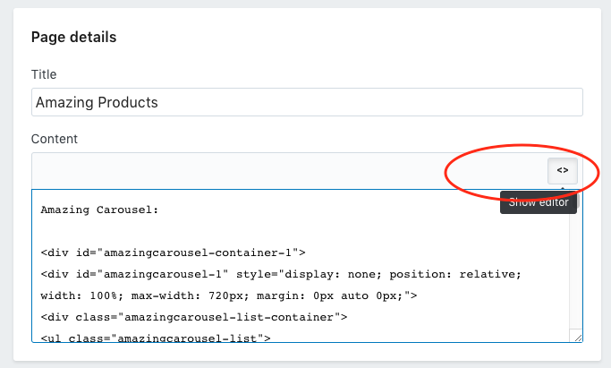 In Shopify, goto your page editor, click the button “Show editor”, then copy the body section code to where you want to display the carousel.